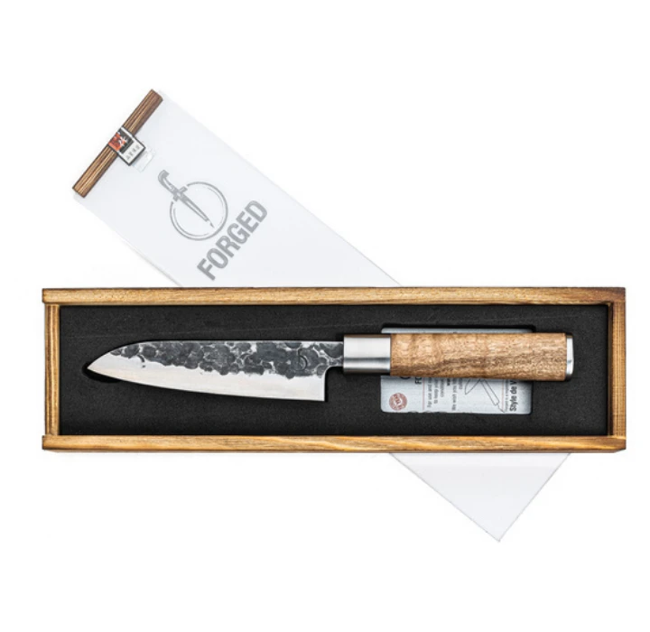 Het merk Forged staat voor een bijzondere en opvallende koksmessencollectie. Door het bijzondere uiterlijk, de mooie verpakking en het volledige handwerk zal dit menig messenliefhebber zijn hart sneller doen laten kloppen. 100% handgesmeed, verpakt in bijzonder gebrand houten kistje. Ieder mes is een UNIEK stuk! Verpakt in een luxe houten kist. NIET vaatwasmachinebestendig. Direct na het afwassen drogen met een doek. De Forged en Intense Forged messen collectie is verkrijgbaar als losse messen of als 6-delige messenset. De collectie bestaat uit een: Koksmes, Universeel mes, Hakbijl, Broodmes, Vleesmes, Schilmes.