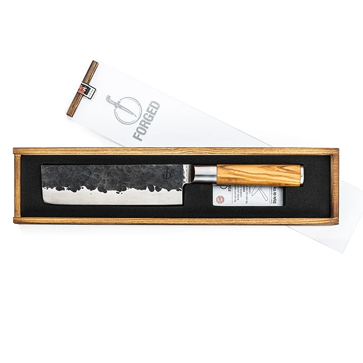Het merk Forged staat voor een bijzondere en opvallende koksmessencollectie. Door het bijzondere uiterlijk, de mooie verpakking en het volledige handwerk zal dit menig messenliefhebber zijn hart sneller doen laten kloppen. 100% handgesmeed, verpakt in bijzonder gebrand houten kistje. Ieder mes is een UNIEK stuk! Verpakt in een luxe houten kist. NIET vaatwasmachinebestendig. Direct na het afwassen drogen met een doek. De Olive Forged messen collectie is verkrijgbaar als losse messen of als 3-delige messenset. De collectie bestaat uit een: Koksmes, Universeel mes, Hakbijl, Broodmes, Vleesmes, Schilmes.