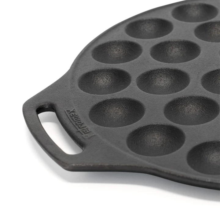De poffertjes zijn qua grote gelijk aan de “oud Hollandse” poffertjes. Alleen deze pan is groter dan de normale pannen.Met deze pan bak je in één keer genoeg poffertjes voor de hele familie. De diameter is 30 cm. De bodem is volkomen vlak. De extra brede handvatten zijn ideaal voor het verplaatsen met handschoenen. Door de hoge kwaliteit gietijzer bereik je het beste resultaat!!Gebruik deze pan binnen op het fornuis of buiten op open vuur of in combinatie met de Atago. Tip: deze pan is niet alleen geschikt voor poffertjes. Maak de leukste kleine gerechtjes met deze pan.