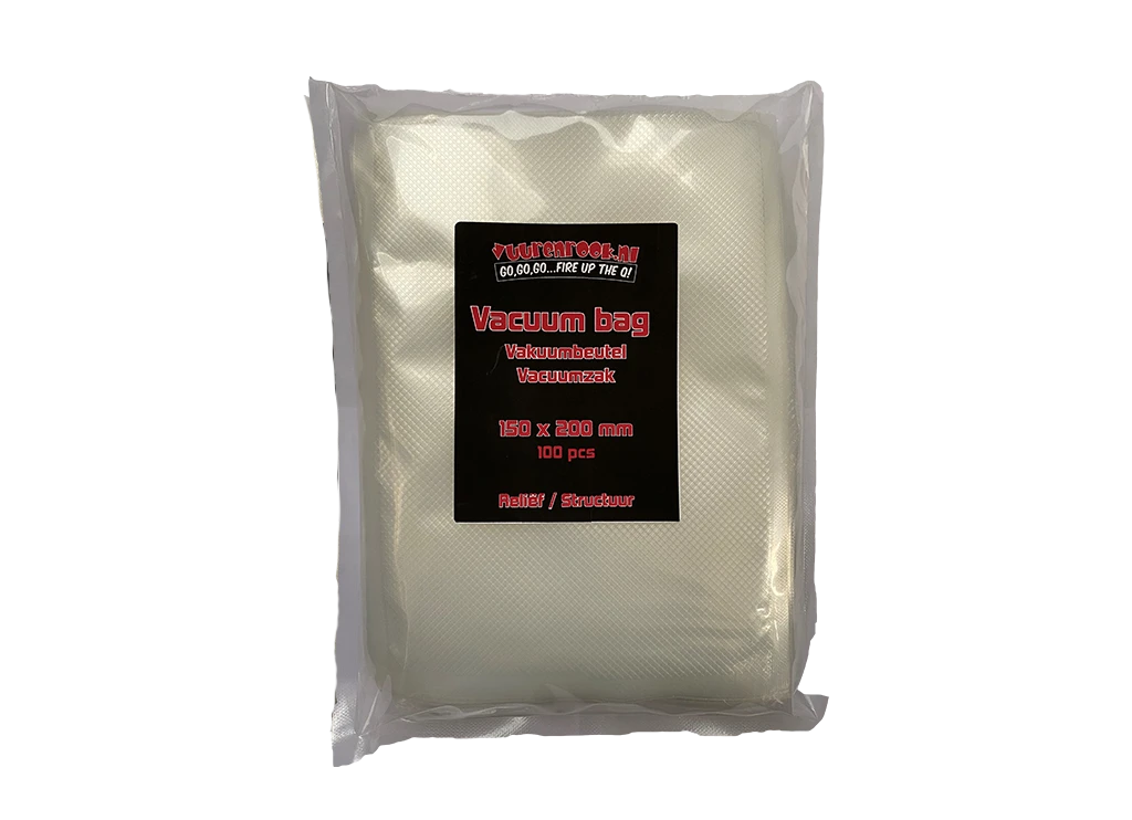 Left over’s van jou BBQ Party, of een goede deal bij jouw slager ingeslagen? Houd je product langer vers met de extra sterke Vacuumzakken (B150 x L:200 mm) van Vuur&Rook. Met een dikte van 105MY. Verpakt per 100 stuks, vries vast tot -40°C en ook zeker geschikt voor Sous-Vide tot 85°C. De zakken passen in alle tafel modellen vacuummachines zoals Solis, Foodsaver etc. Ohja, al onze vacuumzakken en rollen zijn vrij van BPA.